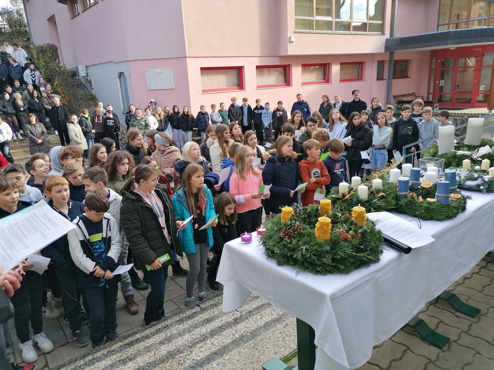 „Licht sein für andere!“ Unter diesem Leitgedanken stand die Adventkranzsegnung, die Pfarrer Mag. Johannes Lang am zweiten Dezember in der Mittelschule Straden durchführte. Die Geschichte vom kleinen Licht, die von Kindern mit verteilten Rollen gelesen wurde, und besinnliche Texte regten zum Nachdenken an. Musikalisch umrahmt wurde die stimmungsvolle Feier von Anna Prassl und Marleen Gether sowie den Pädagoginnen Barbara Flucher und Ruth Langegger. Mit der Segnung und dem Entzünden der ersten Kerze konnte die vorweihnachtliche Zeit in der Mittelschule beginnen.